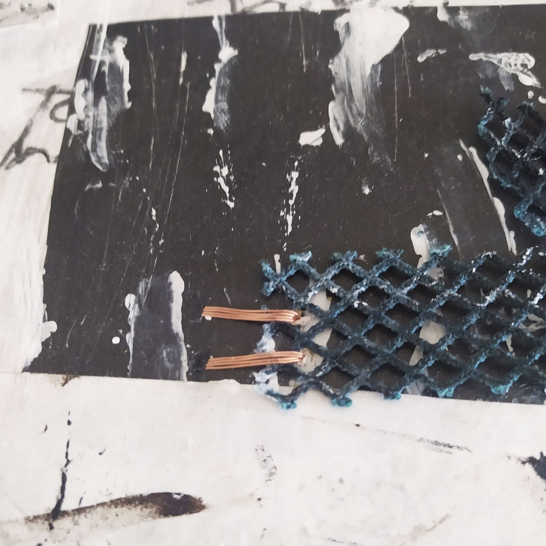 Mixed Media: Acrylics, Handpainted Scrap Papers, Discarded Anchovy Net, Copper Wire