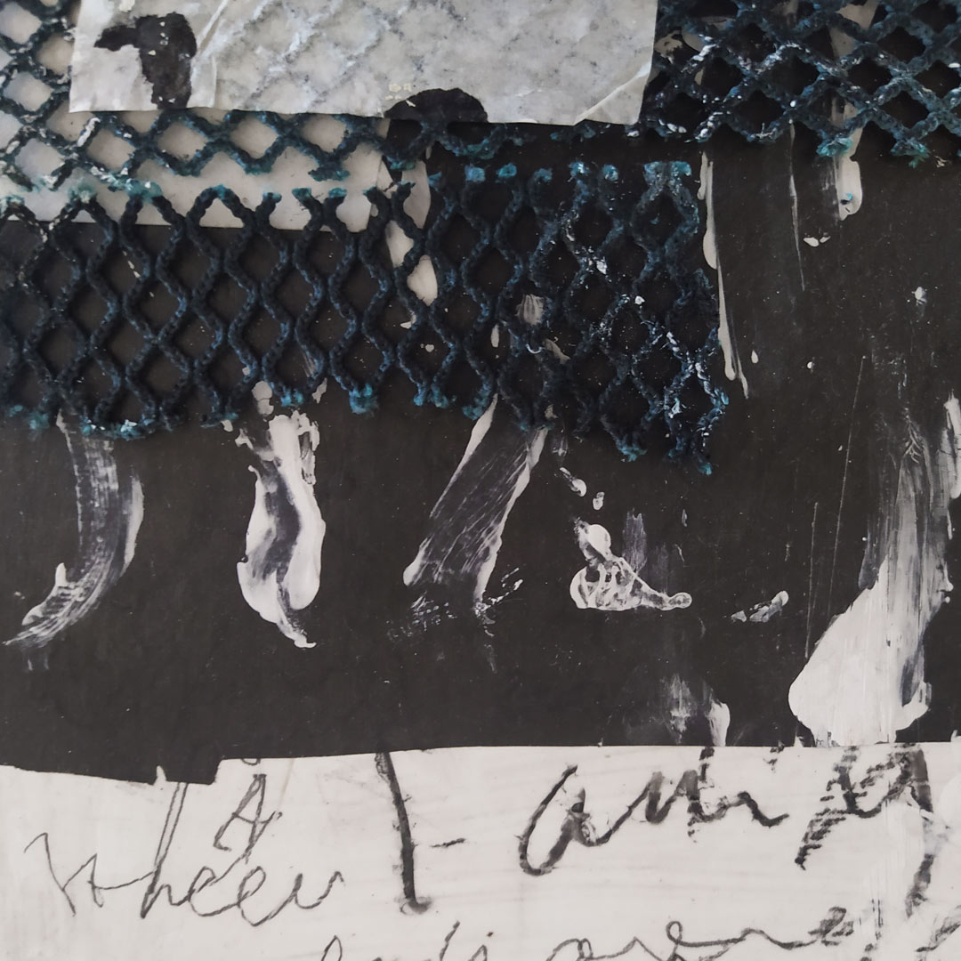 The series is dominated by monochrome lines, finger-painted tally marks, and scribbled cormorant notations. Discarded anchovy nets are stitched with copper wire, overlaying grey areas—both literally and metaphorically.