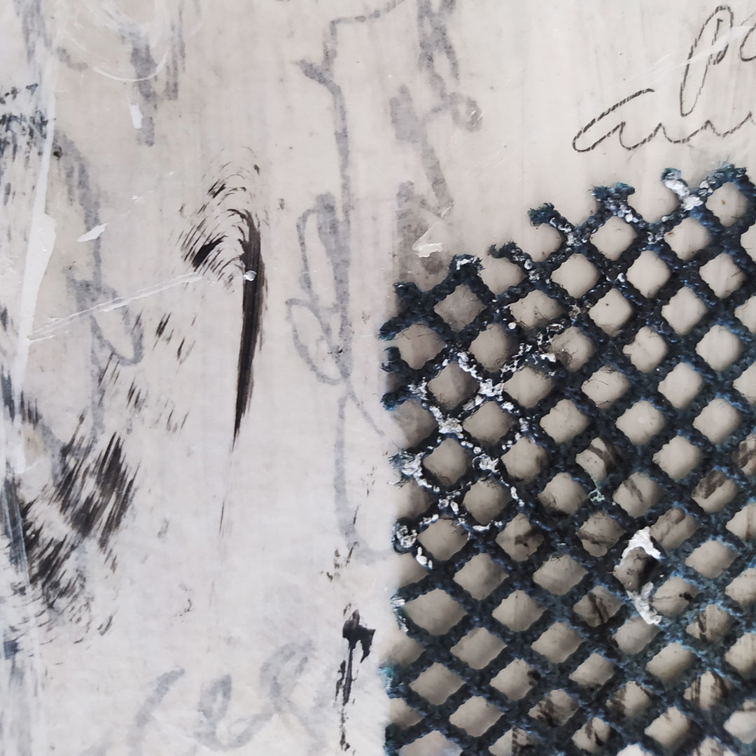 The series is dominated by monochrome lines, finger-painted tally marks, and scribbled cormorant notations. Discarded anchovy nets are stitched with copper wire, overlaying grey areas—both literally and metaphorically.