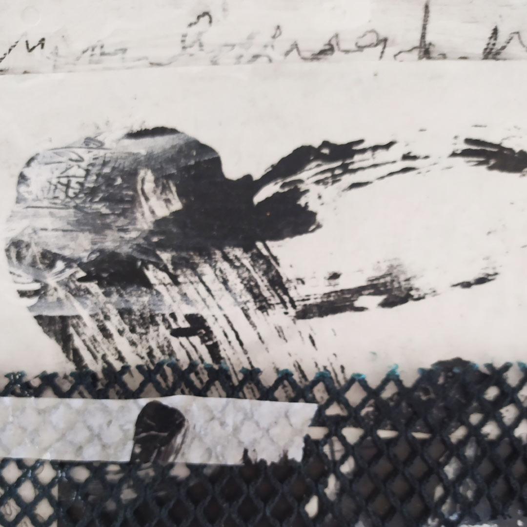 The series is dominated by monochrome lines, finger-painted tally marks, and scribbled cormorant notations. Discarded anchovy nets are stitched with copper wire, overlaying grey areas—both literally and metaphorically.